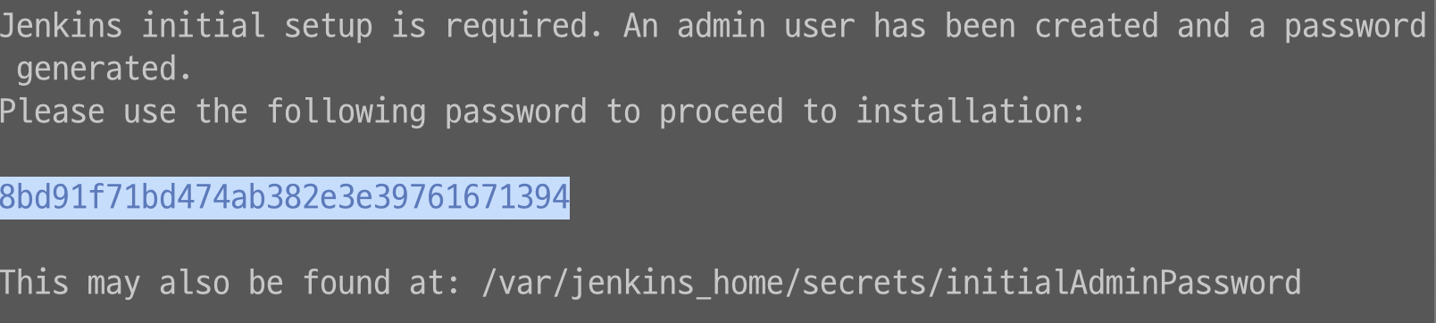 터미널에서 보다보면 패스워드가 생성된다. 제일 처음에 젠킨스를 성공적으로 인스톨후 어드민 비번을 물어볼때 저 부분을 복사해서 붙여넣기 하면 된다. 추후에 어드민 어카운트를 생성할 것이냐고 물어보는데 그때 어드민 어카운트 생성하고 휴먼친화적 비번을 생성하면된다.
